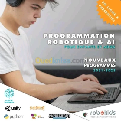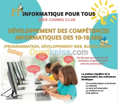 développement des compétences informatiques des 10-18 ans langages de programmation scratch et python, bureautique: word, excel, power point développemnt web, HTML, CSS, Java Script