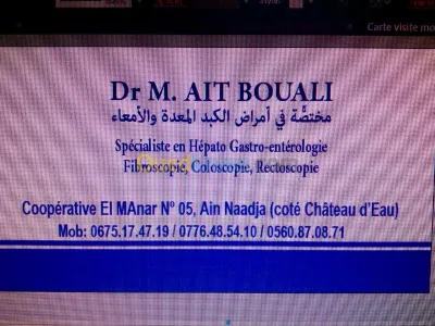 Cabinet medical specialisé en Gastro enterologie , Dr AITBOUALI Malika fibroscopie, rectoscopie,Coloscopie horraires d'ouvertures de 8h00 à 17h du dimanche au jeudi. Samedi de 8h00 à 14h0
