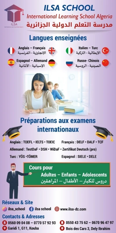 🌍 ILSA SCHOOL – International Learning School Algeria École de langues à Kouba & Dely Ibrahim 🌟 Réductions exceptionnelles jusqu’à -50% sur les cours de : 🇬🇧 Anglais �