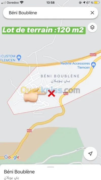 ☎ Lot terrain a vendre Superficie : 120 M² Quatier : Beni-Boubléne vers Lalla setti Act global dans l’indivision Gaz et l’eau