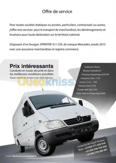 J'offre mes services pour le transport de marchandises, les déménagements et livraisons pour toute destination sur le territoire national. -Prix intéressants - Conduite en toute sécuri