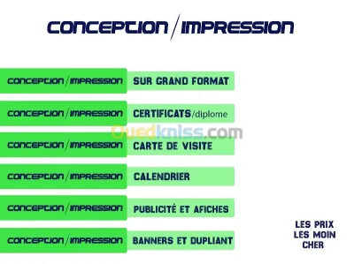 Nous proposons les services suivants avec livraison sur 58 wilayas : Conception et impression numerique de Cartes de visites. Cartes d'invitations. Dépliants. Bannières.