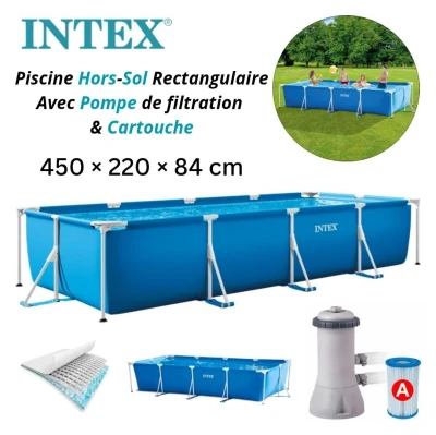 Piscine INTEX 4.5X2.2 mètres * Marque Intex * Capacité7127 Litres * Forme Rectangulaire * Couleur Multicolor * Avec pompe * Poids de l'article: 29 Kg * Fabricant Intex 4.5M x 2.2M x 0.84