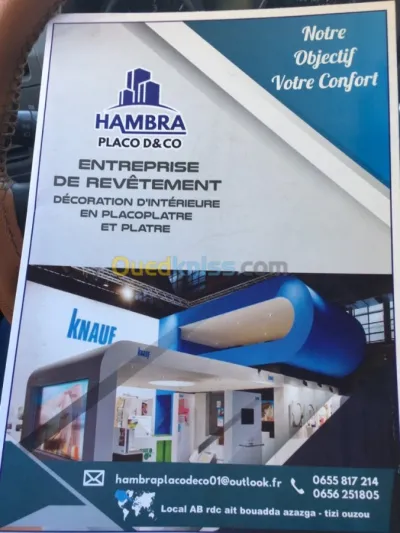 l'Entreprise HAMBRAPLACODECOR, dirigée par des jeunes ambitieux entrepreneurs, spécialisée dans le revêtement, la décoration des intérieures, en placoplatre, platre. Nos travaux