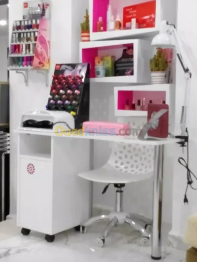 Une table de manucure + fauteuil de pédicure +salle d’attente + les étagère décorative + les cadres
