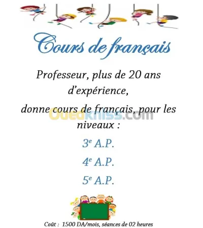 Nouvelle-ville Tizi-Ouzou Professeur, plus de 20 ans d'expérience, donne cours de français pour les niveaux; 3e AP, 4e AP, 5e AP. Nous proposons un programme riche Ecriture, lecture, leç