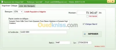 Description :-recherche multicritere .-mise en cage personnalisée.-gestion des modèles d'impression.-suivi des bénéficiaires.-tout type de chèque ;CCP,bna,bdl,badr, etc.