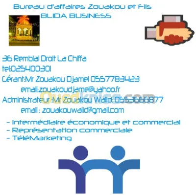 Nous sommes un Bureau d'affaires nouvellement crée à chiffa-blida . Notre équipe est composé entre autre d'un commercial de formation avec une experience solide du réseau commercial du