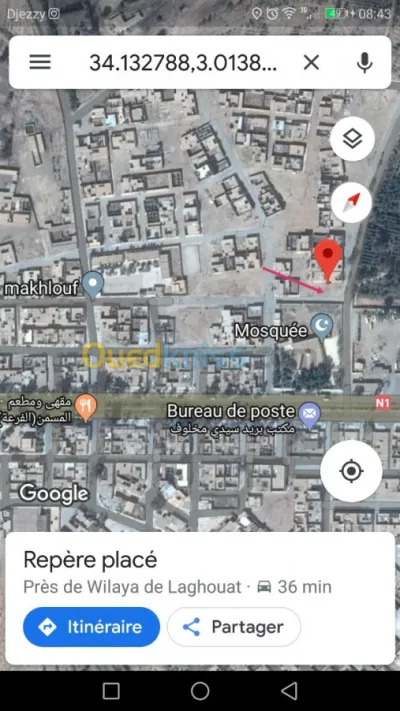 A vendre lot de terrain 600m2 act notarie avec livre fancie a Sidi makhlouf w de Laghoyat , فيها 20متر فاصاد للطريق الوطني رقم 1 2 façade a la route national N"1