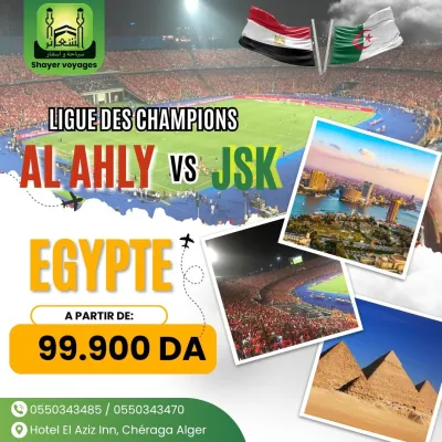 💛💚 Supporter la JSK en Égypte! 💚💛 Vivez le grand retour de la JS Kabylie ⚽️ en Ligue des Champions CAF 🏆 👉 Al Ahly SC vs JS Kabylie – en Égypte, au Caire, au cœu