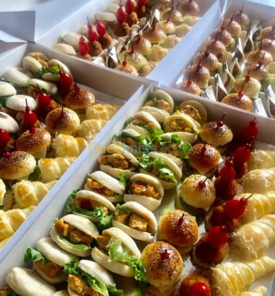Salée (mini birger.les monchons ou des mini pizza...) ou bien sucrées ( mille feuille. Des mini tarte au citron . au chocolat ....) pour toutes vos fêtes et mariage veuillez contacter