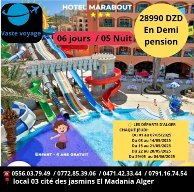 ✔ TUNISIE / SOUSSE par Bus ✔ 06 NUITÉES / 07 JOURS ✔ Hôtel 🏨 MARABOUT SOUSSE ⭐⭐⭐ ✔ à partir de 36.000 Da ✔️ Le Produit inclus : ▪️ Transport par bus tout confort