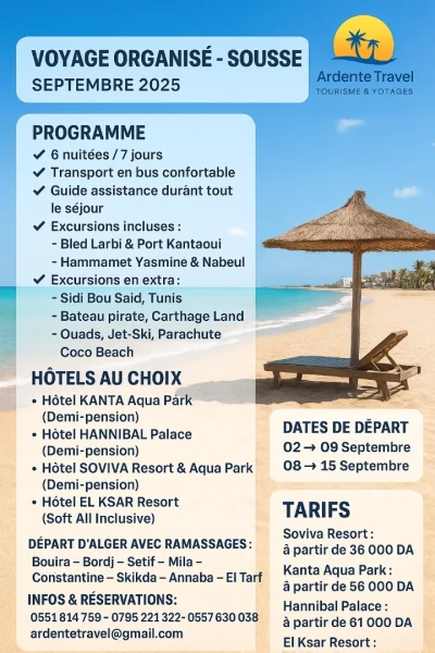 🌴 Voyage Organisé – SOUSSE Septembre 2025 🌊 ✨ Avec Ardente Travel – Tourisme & Voyages ✨ 📍 Programme : ✔ 6 nuitées / 7 jours ✔ Transport en bus confortable 🚍 ✔