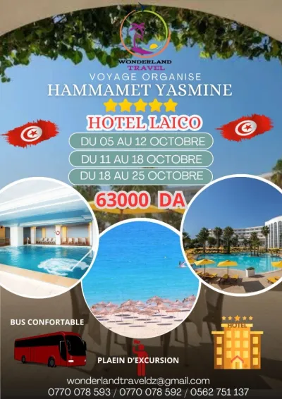 ✔ TUNISIE / HAMMAMET par Bus ✔ 06 NUITÉES / 07 JOURS ✔ Hôtel 🏨 LAICO HAMMAMET ⭐⭐⭐⭐⭐ ✔ à partir de 65.000 Da ✔️ Le Produit inclus : ▪️ Transport par bus tout
