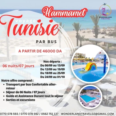 🔴📢 Top promo mois de Octobre Tunisie Hammamet 🇹🇳🇹🇳🇹🇳 par bus 🚍🚍 mois de Octobre ❤❤❤ 07 jour et 06 Nuits 🏢 Hotel Excel ou yasmine beach ⭐⭐⭐ aux c