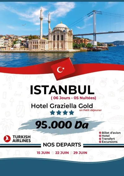 HEBERGEMENT : HOTEL Graziella Gold 4**** 06 JOURS 05 NUITS VOL DIRECT ALGER – ISTANBUL AVEC LA COMPAGNIE TURKISH AIRLINES FORMULE PETIT –DÉJEUNER TRANSFERTS AEROPORT-HOTEL-AEROPORT Nos