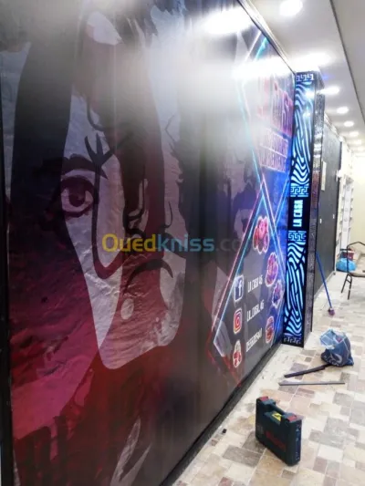 Impression de panneaux publicitaires - Bache 1800 Da mm - one way 1800 Da mm - Autocollants 1800 Da mm - panneau fini avec montage 3500 Da mm - Cartes de visites 4 Da