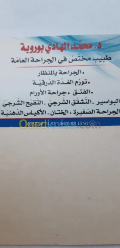 Dr Bourouba.chirurgien viscéraliste. Exerce et opère à la clinique BOUDJELLA. Hadjout.w. tipaza. Du dimanche au jeudi.de 8h à 16h.