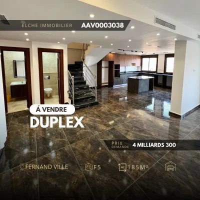 🔸 RÉF : AAV0003038 📣 À VENDRE : Duplex F5 à Fernand Ville, Bir El Djir – Oran, au prix de 4 milliards 300 avec place de parking incluse. 📐 Superficie : 185 m² avec balcons �