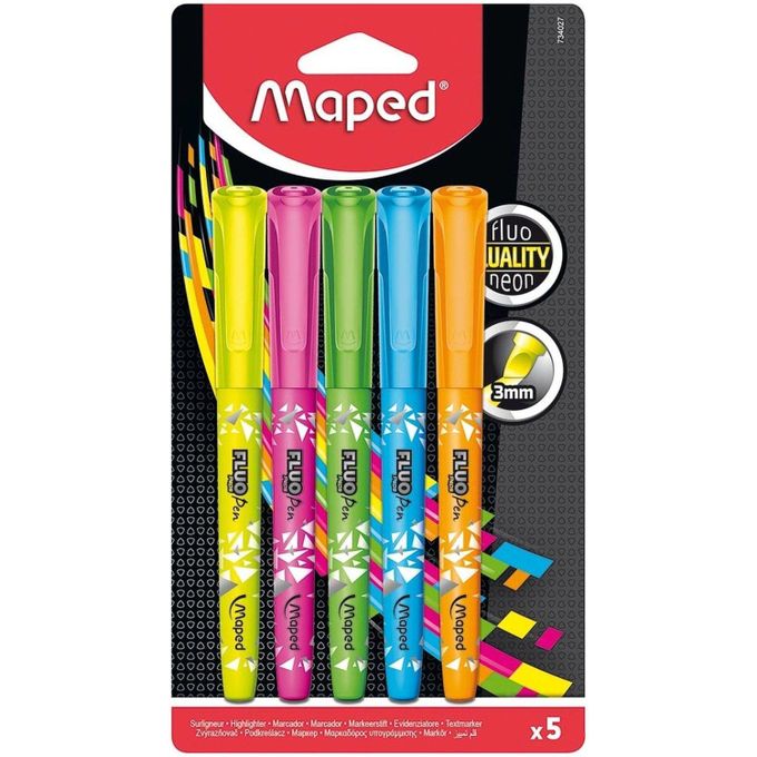Maped Fluo Peps Pen - Pack de 5 surligneurs - couleurs assorties Pointe biseautée. Largeur de trait : 1-5 mm. Format stylo : idéal pour la trousse. Capuchons clipsables. Couleurs ultra lu