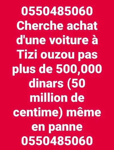 Cherche achat d'une voiture à Tizi ouzou pas plus de 500,000 dinars (50 million de centime) même en panne