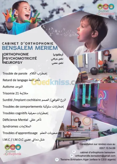 Orthophoniste a bordj el kiffane Reeducation troubles de langage chez l enfant (retard de langage,retard de parole, autisme, béguaiement, retard mental, trisomie 21, surdité) Contactez
