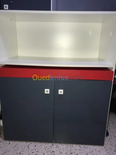 Nous mettons en vente ce beau bureau et rangement en rouge et gris, avec un bureau intégré pour gagner de l’espace et 2 grand rangement l’un d’entre eux avec porte et l’autre a l�