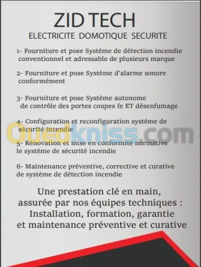 1- Fourniture et pose Système de détection incendie conventionnel et adressable de plusieurs marque 2- Fourniture et pose Système d'alarme sonore conformément 3- Fourniture et pose Sys
