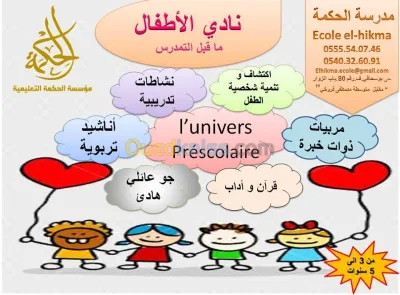 L'établissement scolaire « el-hikma », situé à Bab ezzouar, cité Boushaki, ouvre ses portes pour l’inscription de vos enfants au « club des petits anges ». Nous accueillons vos