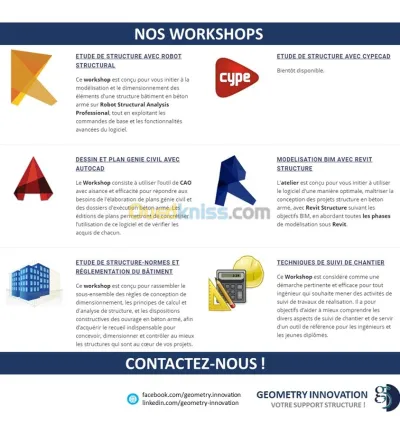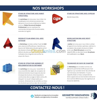 Bureau d'ingénierie et de consulting propose aux nouveaux diplômés en bâtiment et génie civil des ateliers des ateliers pratiques en étude conception et calcul de structures, réalisat