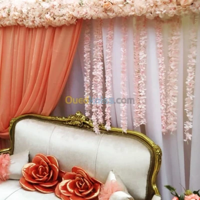 Pour vos fêtes contactez nous . Location scène de mariage complète avec rideau décoré fauteil tapis et petites tables comme sur les photos. Et pour la décoration chaises et tables hou