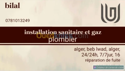 Plombier giniral Installation sanitaire et gaz Riparation de fuite Diplaser et disponible 24/24h A vôtre service كل بلديات العاصمة وضواحيها بأسعار معق