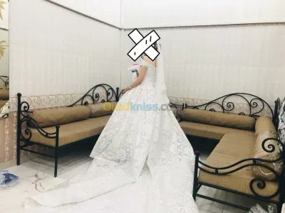 Robe de mariée avec longue traîne amovible acheter 2000€. Prévoir un lavage pressing.