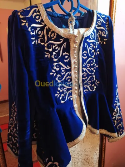 Un joli karakou en bleu roi porté le jour de mariage seulement ,terza a la main en argent avec un serwal chelqa en brocard argent et serwal mdawar en Harar argent aussi et un terboche
