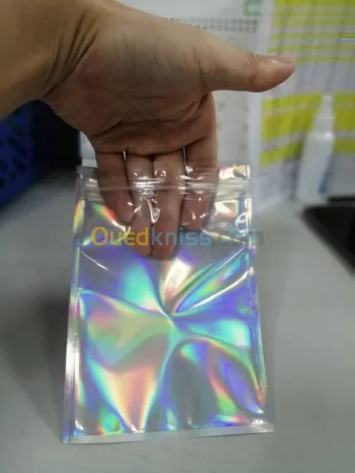 Holographic plastic packaging bag ----------------------------------- Prix et dimmonsion : -11x16x3cm sans sérigraphie 28 da , avec sérigraphie 48 da -18x26x4cm sans sérigraphie 65