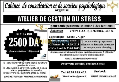surprise : "wissal lancera prochainement une promotion sur son atelier de gestion de stress (1500 DA au lieu de 2500 DA - déjeuner+documentation-). pour s'inscrire , contactez nous au (offr
