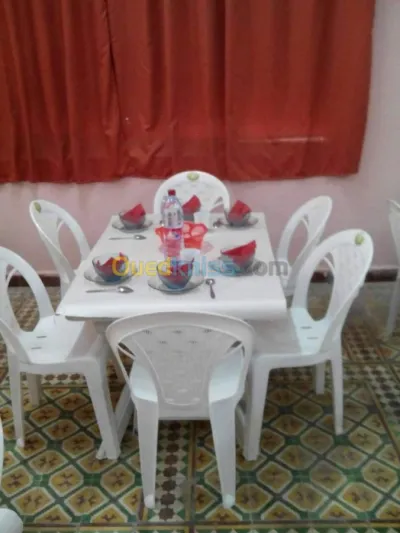Table salle manger ou salon luxe et très bon qualité en bois hêtre disponible en quatre et six sièges confortables vente en série ou détail directement de l'usine a Blida merci de nous