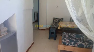 location d'habitation appartement equipée clamatissée pres de la station thermale de hammam boughrara . Rez de chausée composée de 2 chambres + salle a manger +cuisine +S de B. 1er é