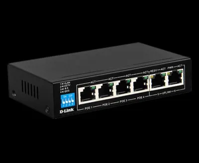6-Port Gigabit PoE Switch with 4 Long Reach PoE Ports and 2 Uplink Ports DGS-F1006P-E 4 x Gigabit PoE+ Ports 2 x Gigabit Uplink Ports PoE+ support - up to 30W per port Long Reach PoE suppor