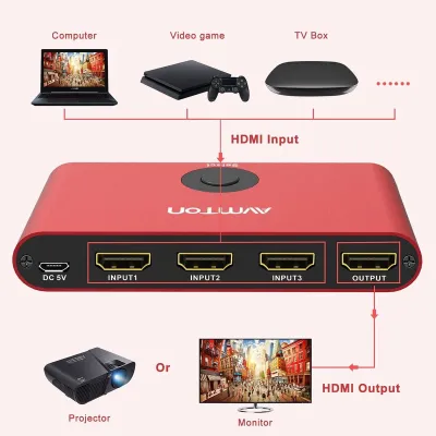 HDMI Switch 3 Port Large compatibilité Le commutateur HDMI 2.0 (HDCP 2.2) Avmton en métal à 3 ports permet de basculer entre trois sources de signal HDMI pour l'affichage sur un moniteu