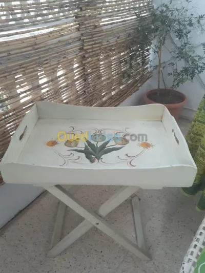 Table composée d'un grand plateau amovible qui repose sur support en bois blanc ,le plateau est peint main avec un tres joli dessin floral; il s'agit du modele Pierre import