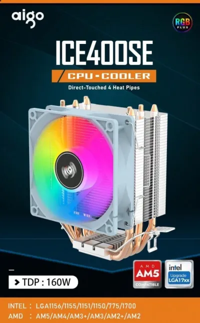AIGO ICE400SE RGB – CPU AIR COOLER 160W, 4 Heatpipes cuivre, RGB silencieux 🔥 🧊 Description CPU AIR COOLER AIGO ICE400SE RGB, idéal pour config gaming 🎮 ou bureautique 💻, tr�