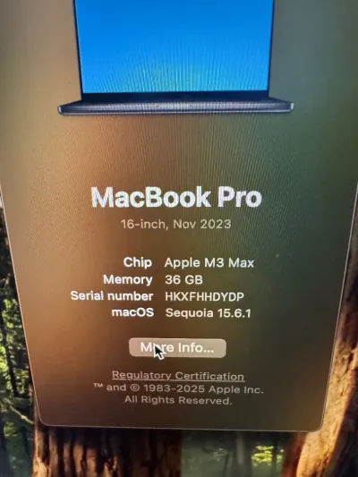 Macbook pro M3 MaX Etat : Comme neuf Stockage: 4Tb ram : 36G Etat de batterie: 90% cycle : 309 fois