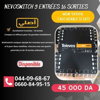 Multiswitch de 9 entrées (une terrestre et 8 Sat, pour toutes les polarités de 2 satellites) et 16 sorties usagers. Par un simple switch, il peut être utilisé en produit terminal (topolo