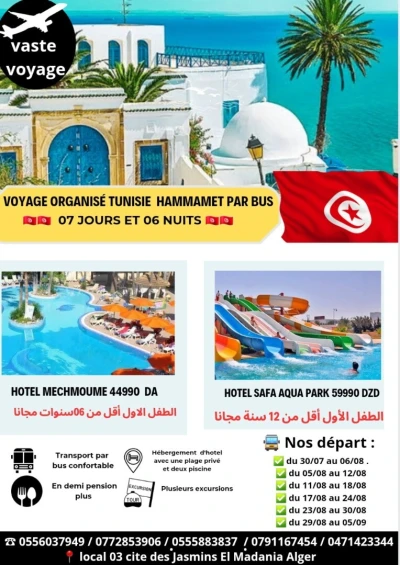 ✔ TUNISIE / HAMMAMET par Bus en JANVIER 2026 ✔ 🏨 Hôtels aux choix ✔ 06 NUITÉES / 07 JOURS ✔ à partir de 30.000 DZD ✔️ Le Produit inclus : ▪️ Transport par bus tout