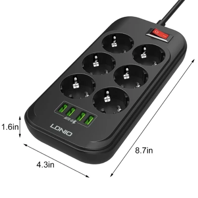 Spécifications générales: Marque: LDNIO Port USB: 4 Prise: Prise UE Poids du produit: 351g Dimensions: 22*10.9*4cm Couleur: Noir Paramètre évalué: 2500W-10A 250V Port de sortie: 6 x ca