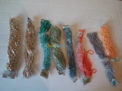 Mercerie met en vente 05 cartons de différents articles : lentilles, colliers, simili torsadé, gouttes, djoher, fleurs, feuilles, cornets, fil de soie en roseau et en . Peuvent même être