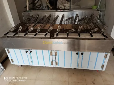 Materiel complet pour restaurant a vendre contient: armoir frigo grande,machine kebab,rotissoir mcm espagnol 8bras , chewaya a la braise inox(تع الفحم), table inox de poulet, 9 table