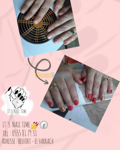 Bonjour,je suis une prothésiste ongulaire certifiée,je travail à domicile ( Les eucalyptus Alger) Tarifs: Pose capsule 2000da Gel sur ongle naturel 1500da Vernis semi permanent 150