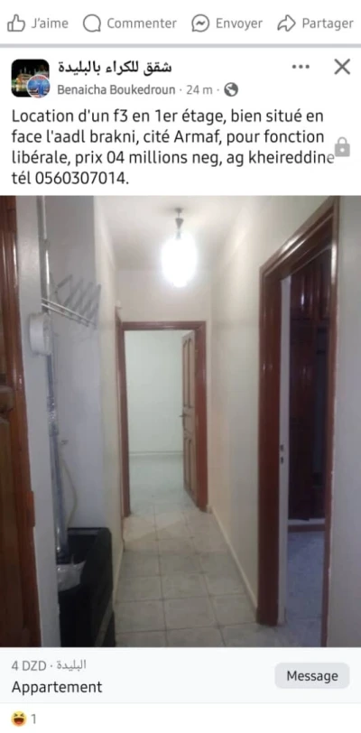 Location d'un appartement f3 en 4 èmes étages, cité lsp, clôturé, parking, gardiennage, dalle de sol, citerne d'eau, bien situé à béni mered, diar el bahri, libre de suite.